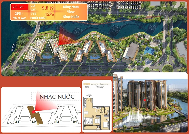 Vị trí đắc địa: Các căn 2PN Tòa A2 thường có view đẹp hướng về Hồ Bơi Sông Rạch Chiếc hoặc view Đông Nam nhìn ra Khu Nhạc Nước, mang lại trải nghiệm thị giác ấn tượng mỗi ngày.